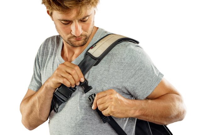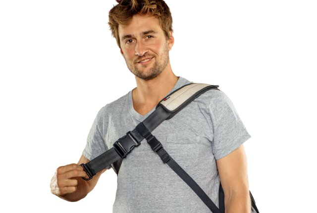 Das gepolsterte Schulterpolster verteilt das Gewicht gleichmäßig. So sitzt Gordon stabil und bequem – auch wenn er voll beladen ist.